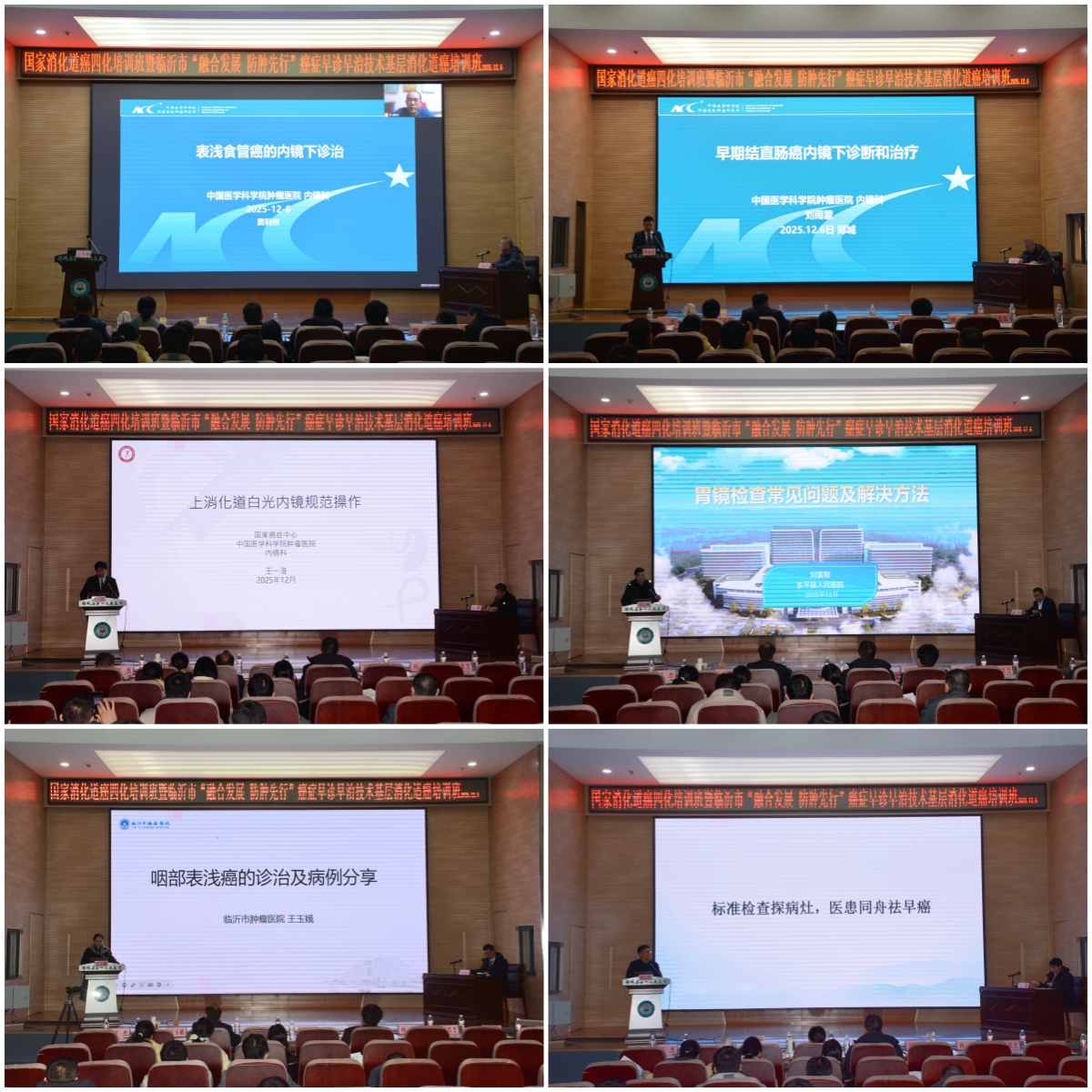 为深入贯彻新时代党的卫生健康工作方针和国家“十四五”国民健康规划要求,推动慢病健康管理和癌症筛查及早诊早治的高质量发展,提高癌症筛查专业技术队伍能力和业务水平,2025年12月6日,由中国医学科学院肿瘤医院内镜科、临沂市癌症中心、临沂市肿瘤医院主办,郯城县癌症中心、郯城县第一人民医院承办,临沂市肿瘤专科联盟协办的消化道癌四化培训班暨临沂市“融合发展 防肿先行”癌症早诊早治技术基层消化道癌培训班在我院多功能楼学术报告厅举办。会议邀请到多位国家及省市专家教授莅临现场或线上进行指导授课。来自全市24家医疗机构的70余名医务人员参加培训。