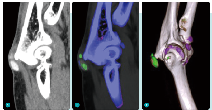 左图为右肘关节矢状位显示肘关节旁稍高密度结节,中图和右图为双能量痛风分析后右肘关节矢状位及VR重建显示肘关节旁结节绿染,与尿酸单钠沉积一致,结果解释为痛风石。