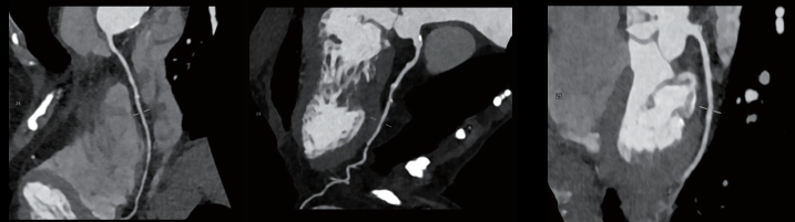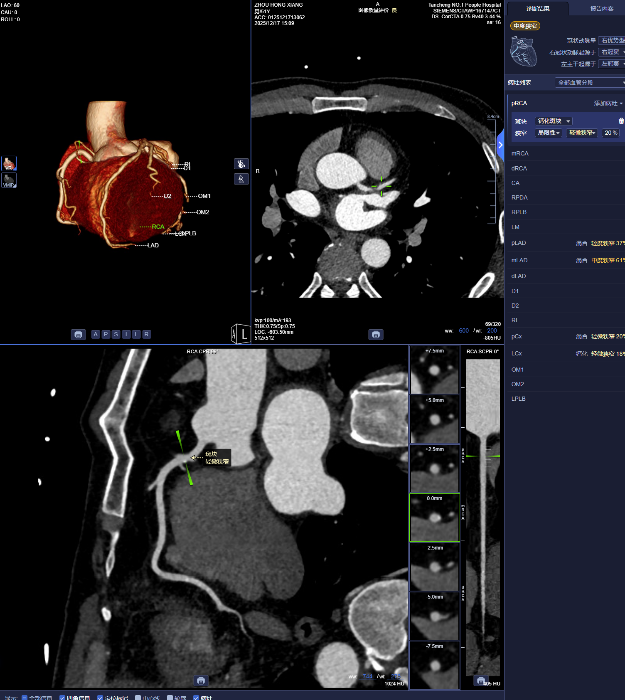 CPR图显示右冠中段钙化斑块,左前降支中段钙化斑块,左回旋支近端少许钙化斑块;无运动伪影。