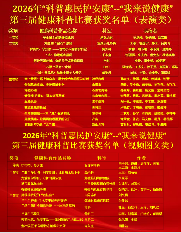 为持续推动健康知识普及,深入落实“预防为主”的卫生健康工作方针,充分发挥医疗卫生机构健康科普主阵地、医务人员健康科普主力军的作用,响应2026年“512国际护士节““赋能护士,守护生命”的主题精神,4月15日,我院举办“科普惠民护安康”健康科普作品展示活动暨“我来说健康”第三届健康科普比赛。