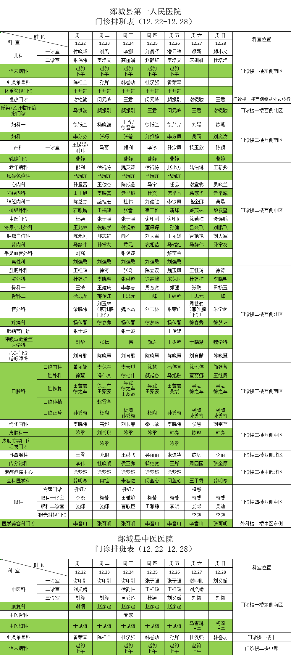 一周门诊医生值班表(12月22日—12月28日)