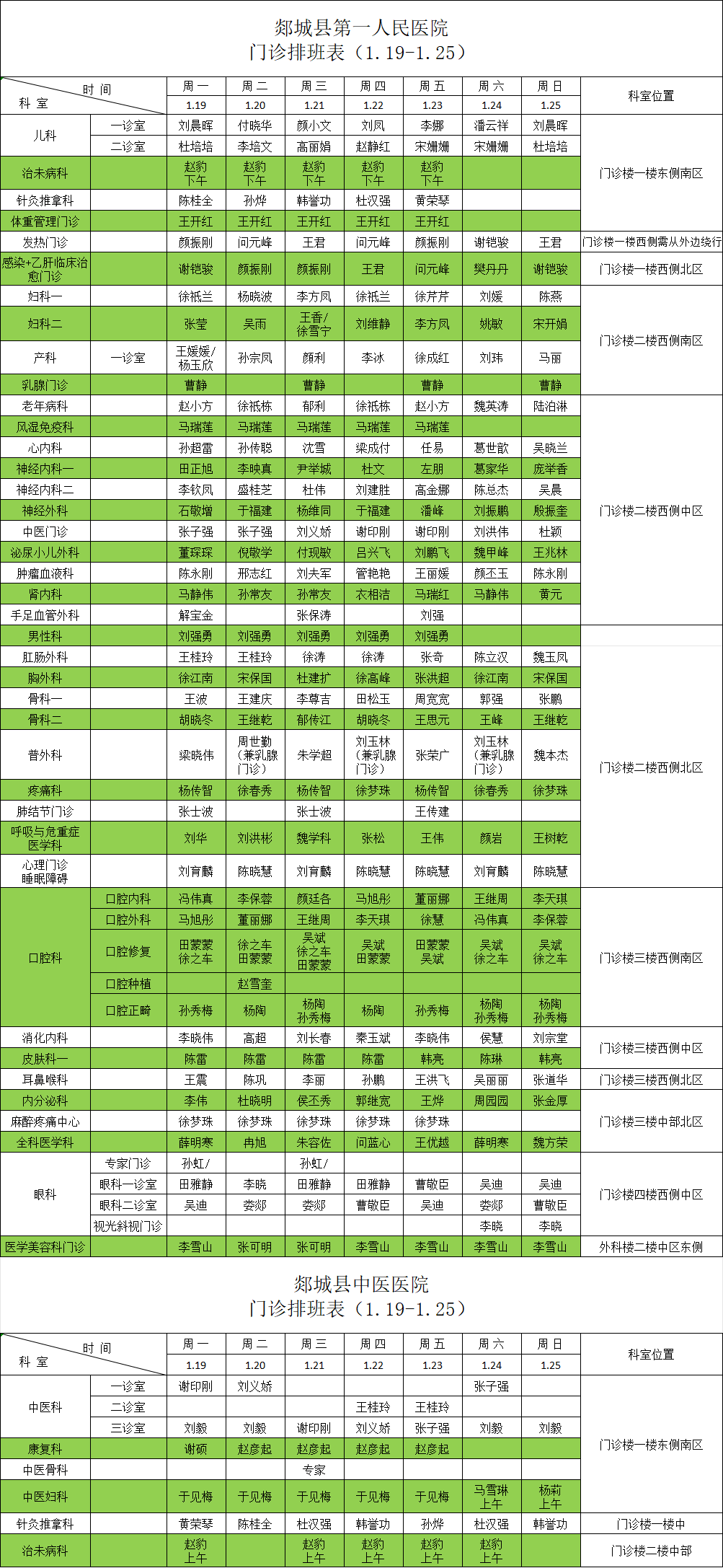 一周门诊医生值班表(1月19日—1月25日)