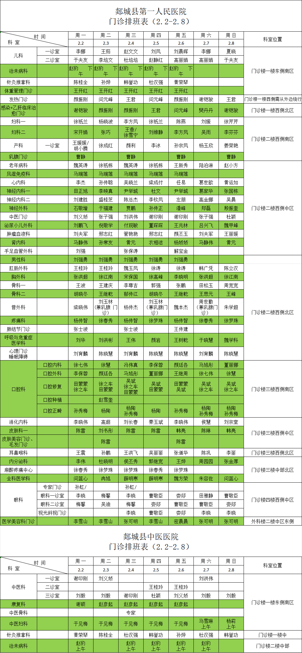 一周门诊医生值班表(2月2日—2月8日)