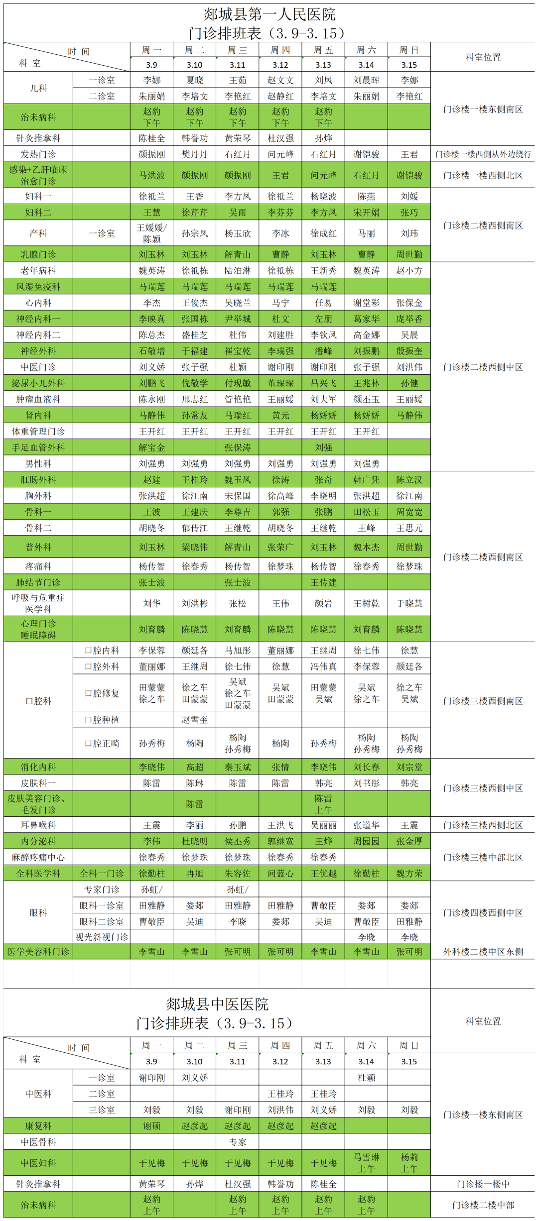 一周门诊医生值班表(3月9日—3月15日)