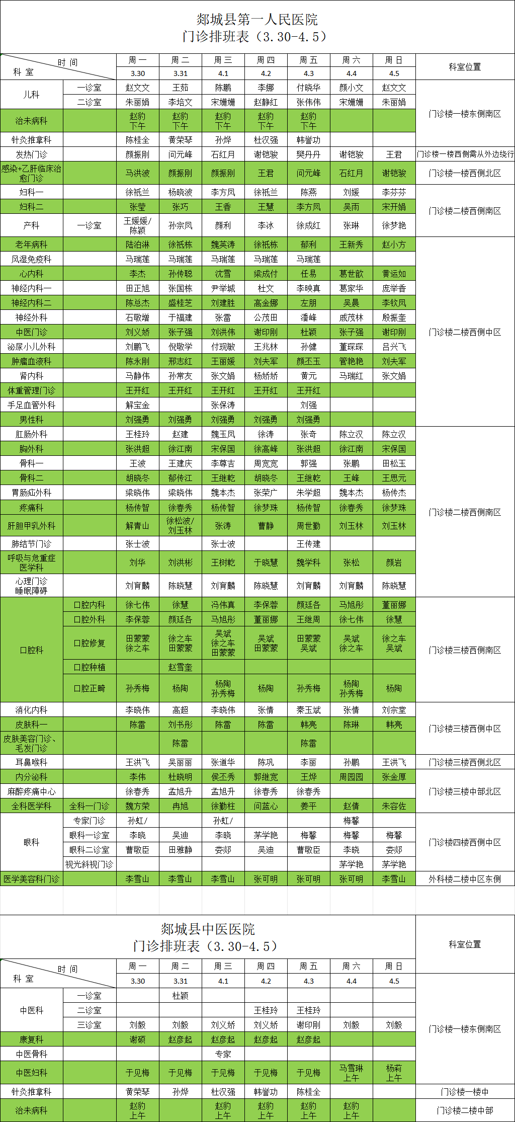 一周门诊医生值班表(3月30日—4月5日)