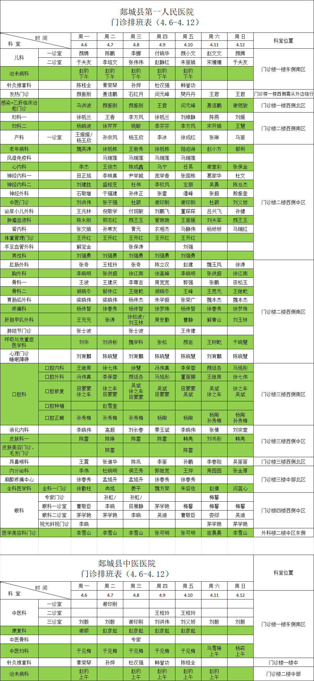 一周门诊医生值班表(4月6日—4月12日)