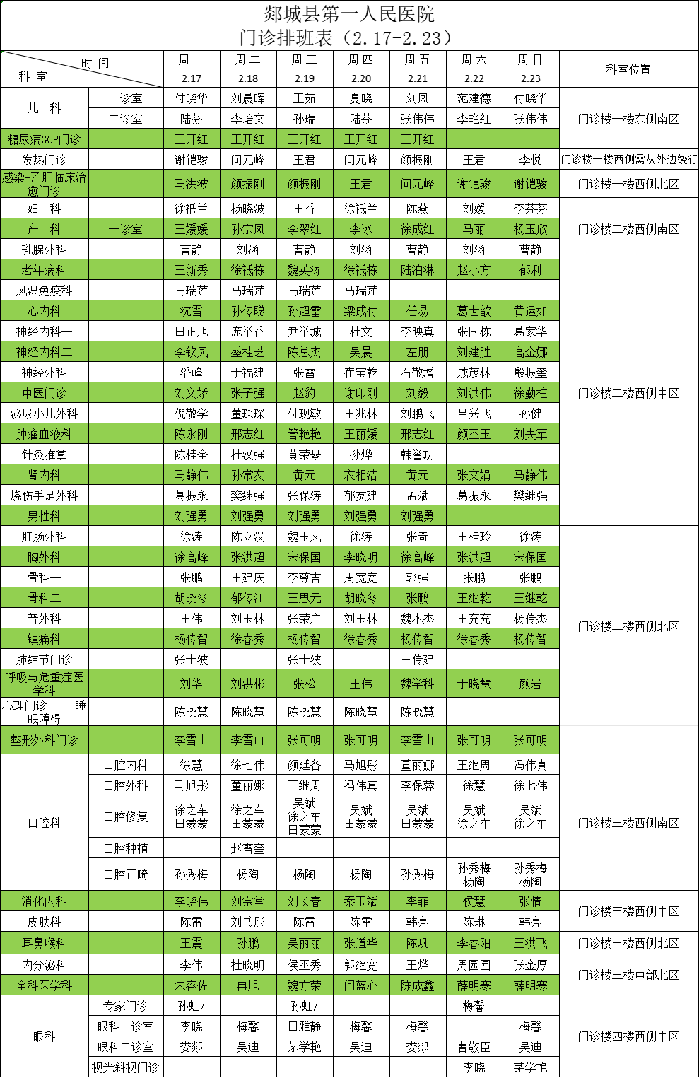 一周门诊医生值班表(2.17-2.23)