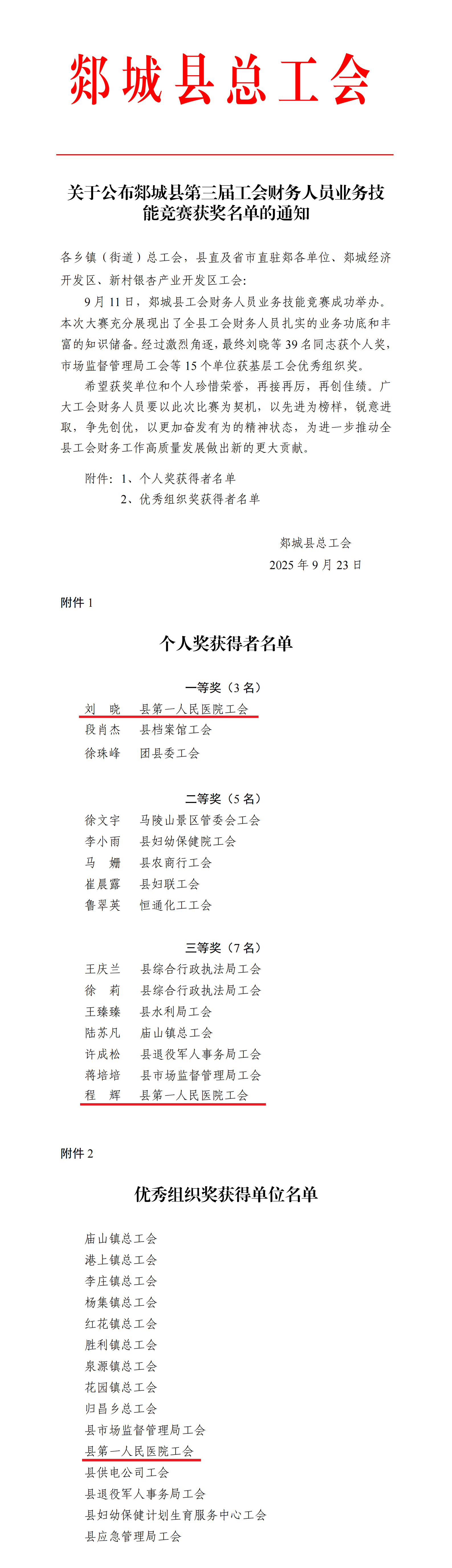 9月11日,在县工会举办的郯城县第三届工会财务人员业务技能竞赛中,我院参赛队伍表现突出,不仅斩获个人奖项,还荣获集体荣誉,充分展现了我院工会财务人员过硬的专业素养与良好的团队风貌。