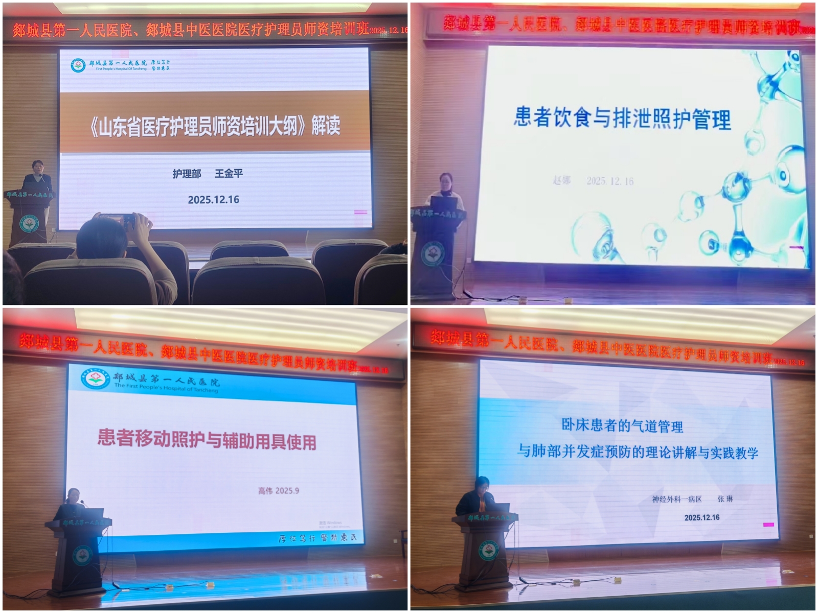 本次培训紧扣临床实际需求,课程设置全面系统,涵盖八大核心内容。护理部主任王金平就《山东省医疗护理员师资培训大纲》及免陪照护服务相关政策法规进行了解读,为培训工作夯实了理论基础;赵娜护士长聚焦患者常见安全风险的早期识别与防范,详细讲解了饮食与排泄照护要点,强调护理员在风险预警和信息传递中的重要作用;高伟护士长通过示范教学,生动讲解了患者清洁舒适照护、移动照护与辅助用具使用等实操技能,细化了操作规范与安全注意事项;张琳护士长则围绕卧床患者的气道管理、吞咽障碍患者的营养管理展开专业授课,重点演示了叩背排痰、雾化吸入等关键操作,助力提升患者的呼吸功能与进食安全。