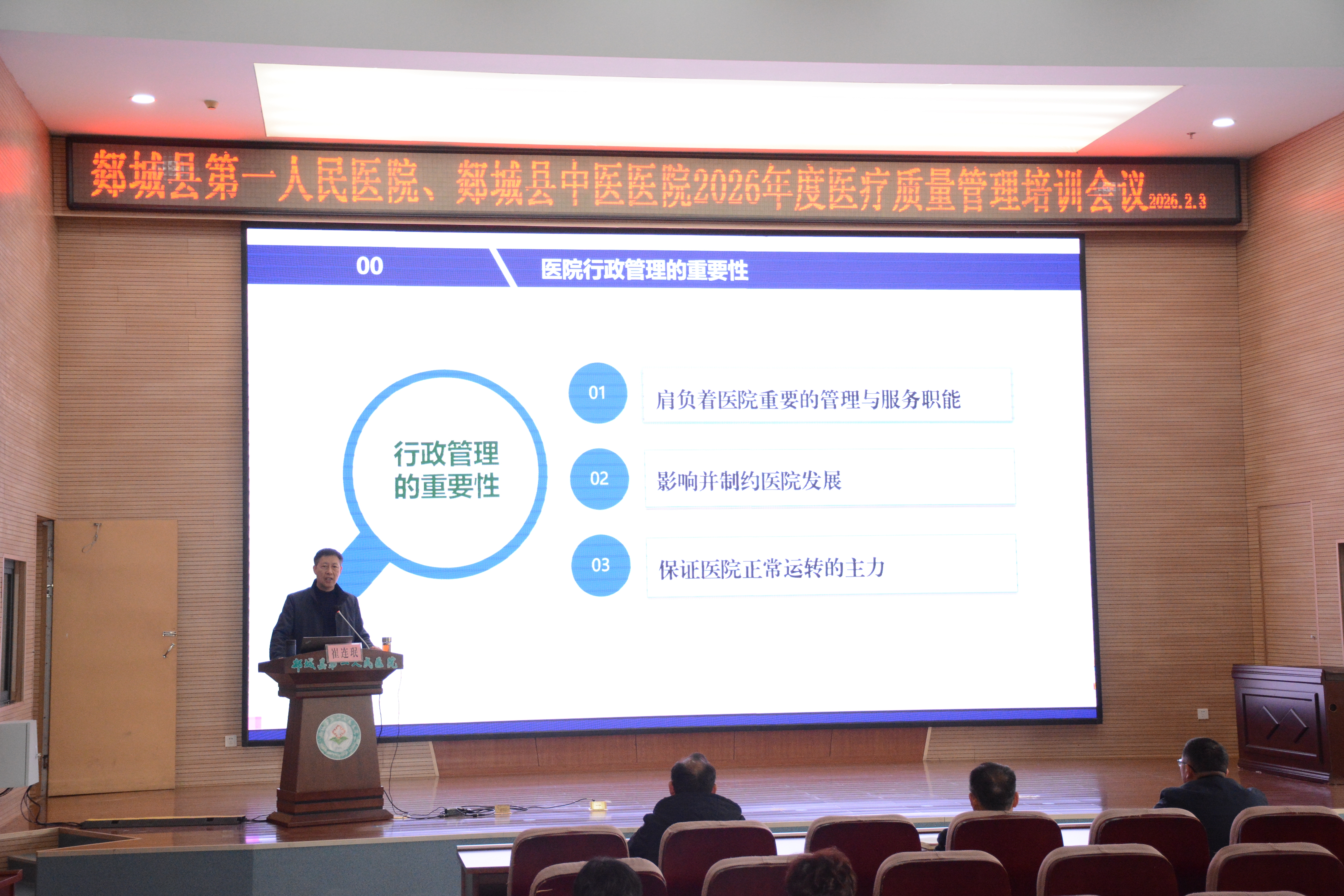 为筑牢医疗质量安全防线,健全院科两级质量管理责任制,提升中层干部履职能力,2月3日下午,我院在多功能楼学术报告厅举办2026年度医疗质量管理培训会议。本次培训特邀医疗质量管理及等级评审领域权威专家崔连珉教授授课,医院领导班子成员出席,各科室主任、护士长,院级与科室质控员等相关人员参加培训。会议由院党委委员、副院长吴清安主持。