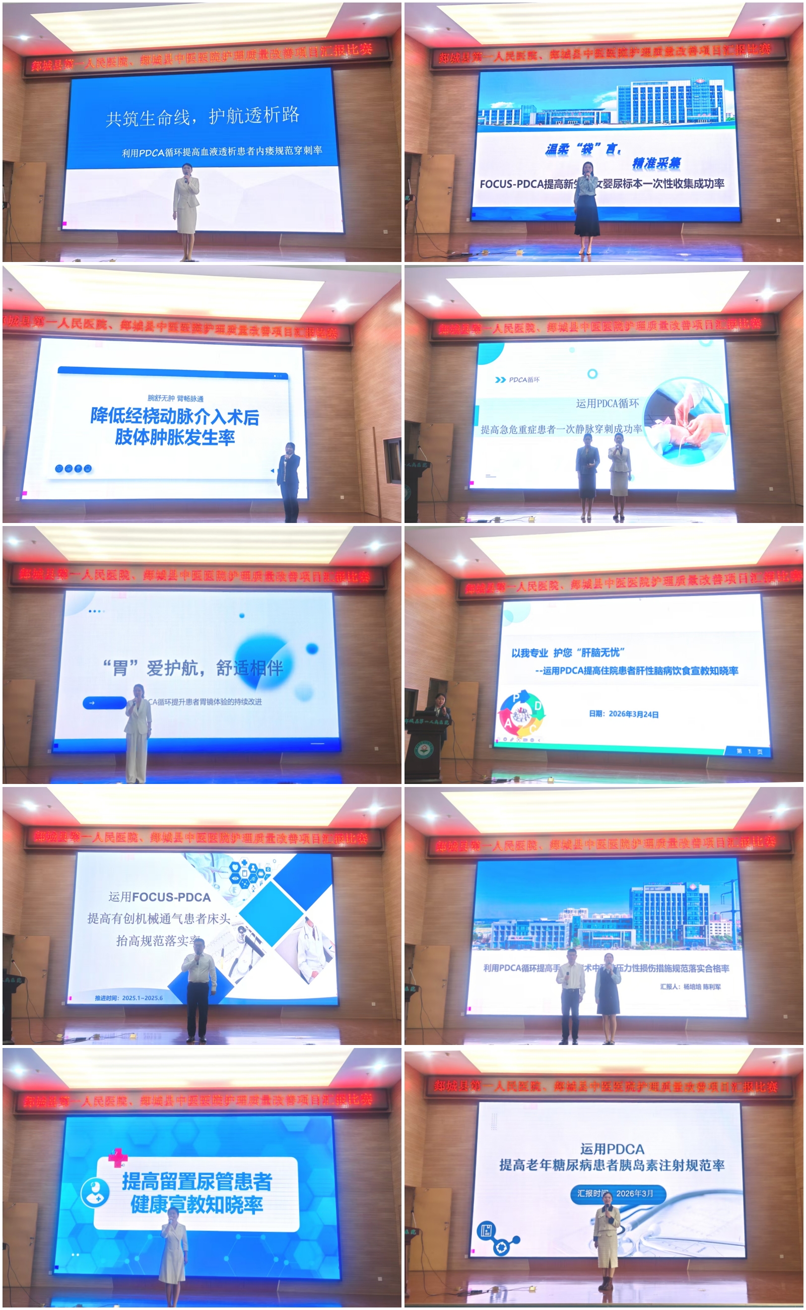 本次比赛共有38项护理质量改善项目参与汇报。各参赛选手围绕项目立项背景、实施步骤、目标达成、管理工具应用及临床效果巩固等核心内容,在5分钟内完成现场汇报。比赛现场,选手们准备充分、思路清晰,通过直观的图表数据与详实的实践案例,生动展现了各护理单元运用PDCA、品管圈等工具解决临床护理问题的实践成果,充分彰显了我院护理人员扎实的专业能力与积极进取的工作风貌,也为医共体成员单位提供了宝贵的护理质量改善经验。